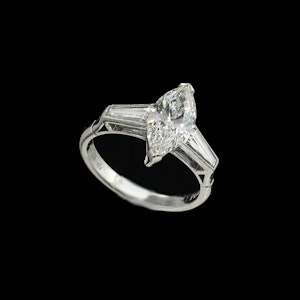 A vintage diamond ring, set with a 0.81ct baguette-cut diamond, accompanied by GCS certificate 5783-622, stating that the colour is F and the clarity is VS2. The centre stone is flanked by eight,...