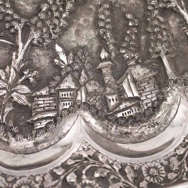 The tray has been ornamented in repousse and chased techniques. Floral decoration, typical of the Kutch style, stretches from the decorative scalloped edge to the crisply lobed plain silver cavetto, forming a shining band of crescent moons. The area between the cavetto and the central panel portrays a fertile and beautiful landscape, including many different types of trees, flowers, grasses, hills and rivers with occasional architectural vignettes of substantial buildings and simple huts. People are depicted going about their daily business, quietly tending to their crops or returning from fishing and harvesting.