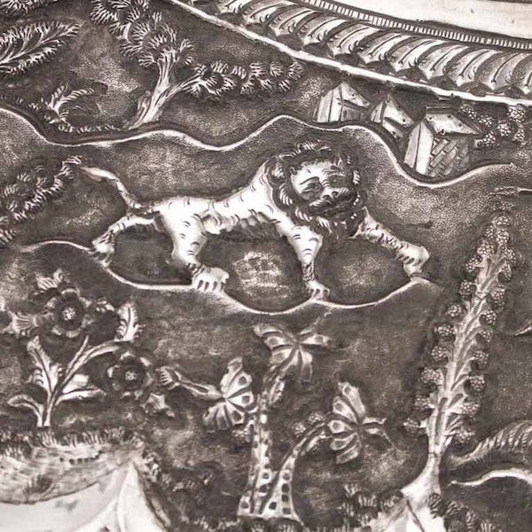 Hunting scenes were a favourite decorative design and often depicted on Lucknow silver. In the midst of the rural tranquillity a lion hunt is in progress; the hunter is standing in a howdah on top of an elephant with his gun pointed at a lion whilst the mahout sits astride the elephant’s neck, holding a pair of binoculars. Another attendant has already been overcome by a lion and lies prostrate on the ground with his dagger drawn, attempting to defend himself.