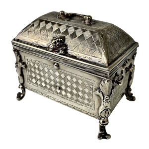 Small silver casket in the shape of a travelling trunk. These trunks were made in the early 1700 in Spain and in Mexico. The Mexican types were covered in tortoise shell and mother of pearl, this can...