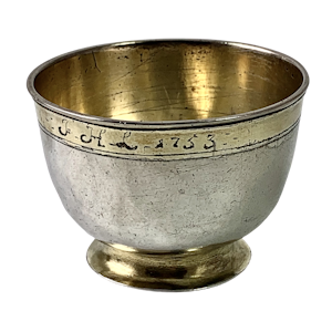 Partially gilt silver vodka cup , inscribed with the owners initial and dated 1753. Marked on the underside with the town mark of Dorpat...