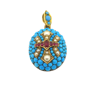 Victorian domed turquoise, pearl and natural ruby pendant with an opening glass at the rear....