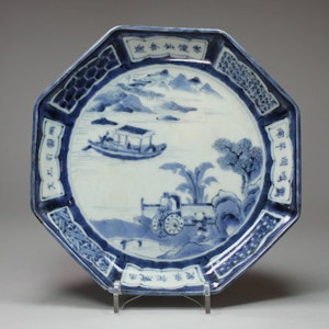 Japanese blue and white octagonal dish, 18th century, decorated to the central roundel with a lakeside boating scene, containing a figure upon a boat with a canopy and two further figures on the rocky...