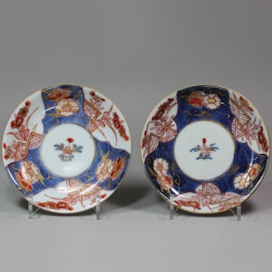 Pair of Japanese Imari saucers, early 18th century, each decorated with a central roundel in reserve containing a single floral sprig, the wide gently curving sides with three cloud-shaped cartouches...