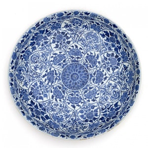 Rare massive Chinese blue and white charger, early Kangxi (1662-1722), finely painted in a bright underglaze cobalt-blue, with a lotus head in a central roundel encompassed by four bands of radiating...