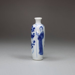 Miniature Chinese blue and white sleeve vase, Kangxi (1662-1722), the slender body decorated with alternating panels containing Long Elizas and floral sprays...