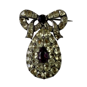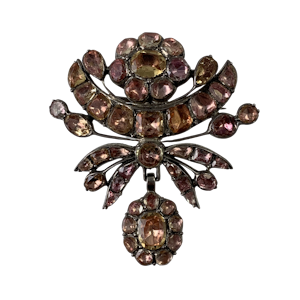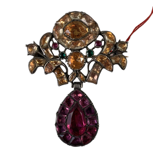 Ca 1770 silver brooch with foiled topaz. The drop is contemporary "ruby" paste...