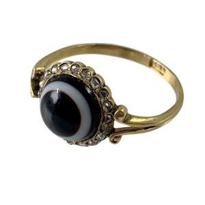 Antique gold ring ca 1820 with oval garnet and diamond surround...