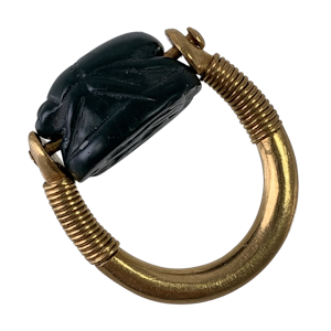 Ancient Carthaginian green jasper scarab with engraved underside with later gold mount. Scarab ca 600 BC. Mount ca 1880....