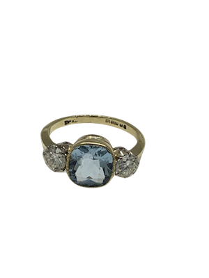 A beautiful rub over aquamarine flanked by a brilliant cut, claw set diamond on each side. Mounted on 18ct yellow gold. Size . Circa, 1983. Fully hallmarked....