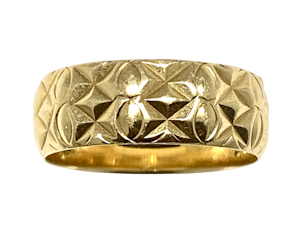 A stunning 18ct gold engraved band. The perfect chunky gold accessory. Circa. 1965. Size N....