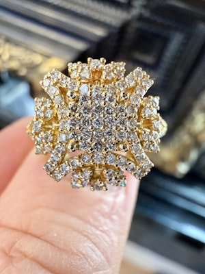 A beautiful diamond cluster ring from 1981, crafted in 18ct white gold and hallmarked “750 ROSE.”...