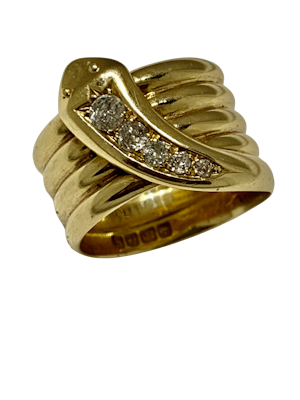 An absolutely stunning example of a fully hallmarked 18ct gold Coiled Snake Ring with beautiful old cut diamond detailing. Circa 1836. Ring size V. An elegant antique piece with a contemporary feel....