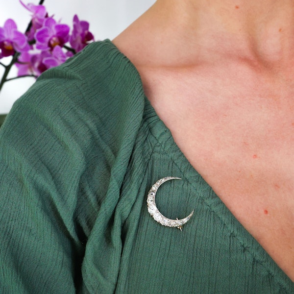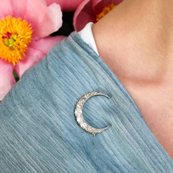 An antique crescent moon brooch, set with a single row of old-cut diamonds, graduating in size, tapering to rose-cut diamonds, weighing an estimated total of 4.00 carats, claw set in silver-upon-gold, with a plain inner curve and cut down set outer curve, with a later pin and roller catch fitting, English, circa 1890. In Victorian symbolism the crescent or new moon represented a new relationship. Hopeful it will "wax" into matrimony.