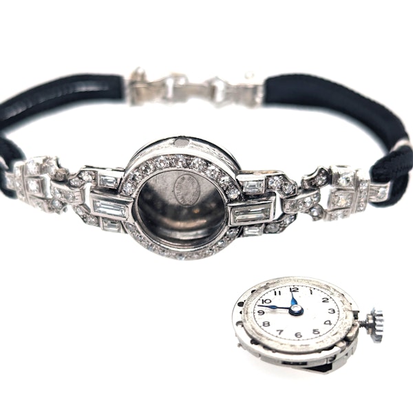 An Art Deco diamond and platinum cocktail wristwatch, with a white, round dial, with black Arabic hand painted numerals, within a ring of minute markers, with black enamelled hands, with an eight-cut diamond set surround, with millegrain edges, with a baguette-cut diamond, in rub over settings, at the top and bottom of the face, in a round, two part platinum case, the shoulder strap terminals are set with eight-cut diamonds, in a geometric Art Deco design, of two links, joined to the case with baguette-cut diamonds, the crown winder is marked with a letter A, inside is a Swiss, 17 jewel, manual wind movement, the inside of the case is marked with "all platinum Bristish made", repair or service marks: 2561, B14(or6)269AT50, B5886/55, 8364/1A2, on a black woven, double cord strap, with plain, platinum clamps and an eight-cut diamond set platinum clip clasp, circa 1930.