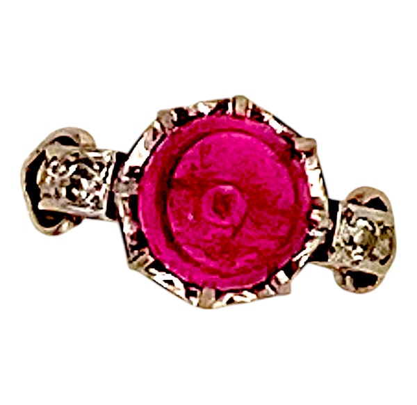 Art Deco pink tourmaline cabochon and diamonds fancy ring.