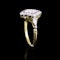 An outer surround of rose cut diamonds adds further sparkle, all grain set within millegrained platinum edges, with an openwork gallery and diamond set foliate shoulders.