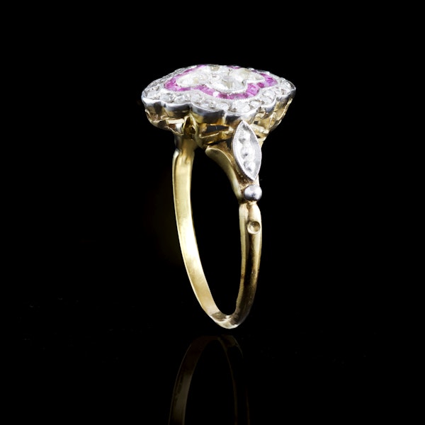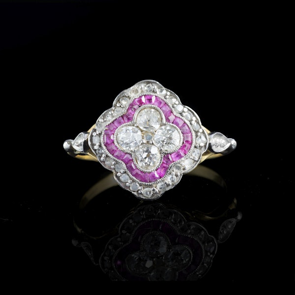 A vibrant Art Deco ring from the 1920s, finely crafted in platinum topped 18 carat gold, featuring a central quatrefoil cluster of old European cut diamonds, approximately 0.65 carats in total, and framed by a border of calibré cut rubies of around 0.40 carats.