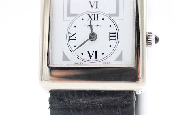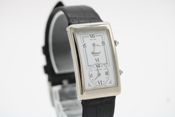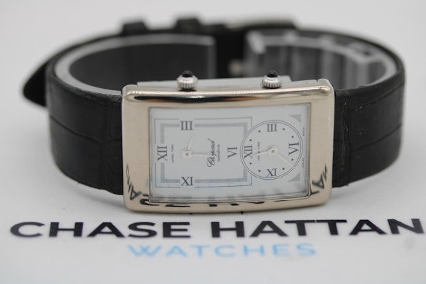 A beautifully elegant Chopard 2240, crafted in solid 18K white gold and paired with a refined black leather strap. Combining Chopard’s signature design flair with precise dual quartz movements, this timepiece embodies understated luxury and timeless style.
