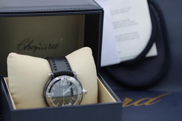 Never again will you find as complete a set as this, loads of service papers accompany this watch. Originally sold in Selfridges in the UK in 2009 (original receipt), serviced in 2010 with Chopard and then again in 2023 all documented. In addition to this we have the original inner and outer box along with the original Chopard certificate.
