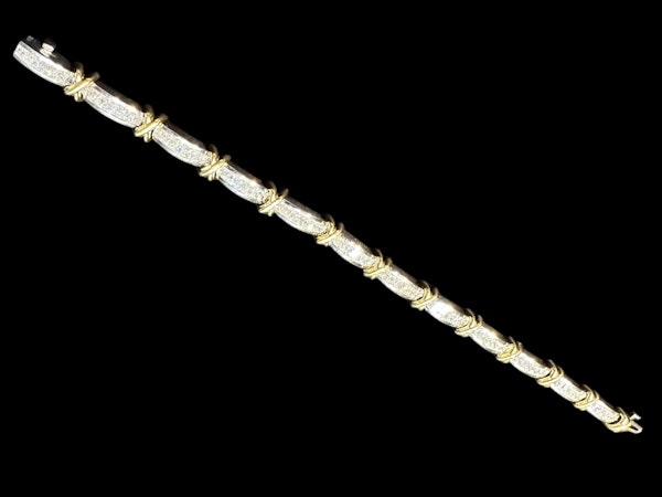 In the style of Tiffiany & Co's Jean Schlumberger's collection, this stunning bracelet has 6.7ct of beautiful Baguette Diamonds, set in 18k White Gold, accented with 18k Yellow Gold crosses.