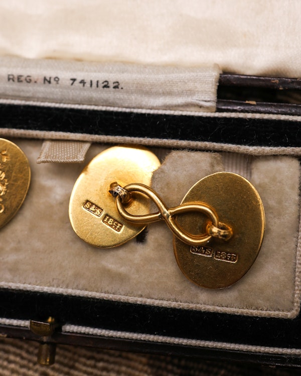 Downstairs at Grays: A beautiful pair of 18 Carat Yellow Gold "Heraldic Sypher" Engraved Cuff links. Circa 1900