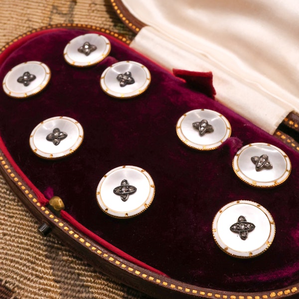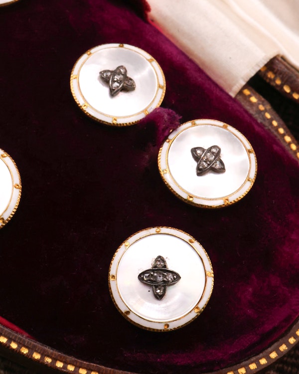 Eight circular panels of Mother of Pearl, each panel crossover set with five Single Cut Diamonds, the panels edged in white enamel with gold highlights. This beautiful set comprises of a pair of fine Cufflinks and four Dress Studs, the fasteners for the studs concealed under the removable velvet pad.