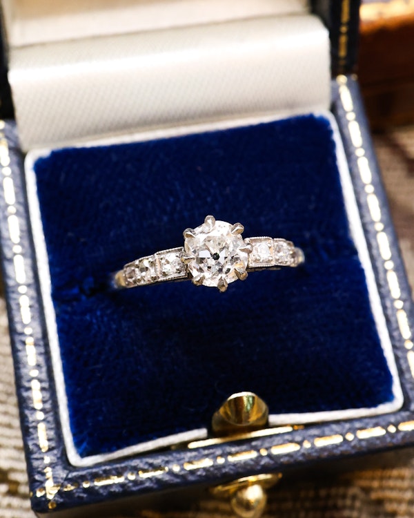 A very Fine Platinum (Marked') and 'Old Cut' Diamond Solitaire Ring with 'Step' Shoulders. The Central 'Claw' set Diamond weighs 0.71carats and of 'G' colour and SI1 clarity, the side stones are' Old Cuts' and are assessed to be 0.18carats , of G-H colour and VS-SI clarity as assessed and certified by an independent gemmologist.