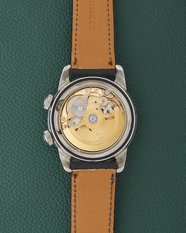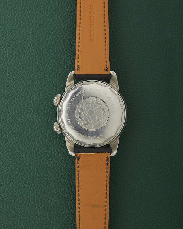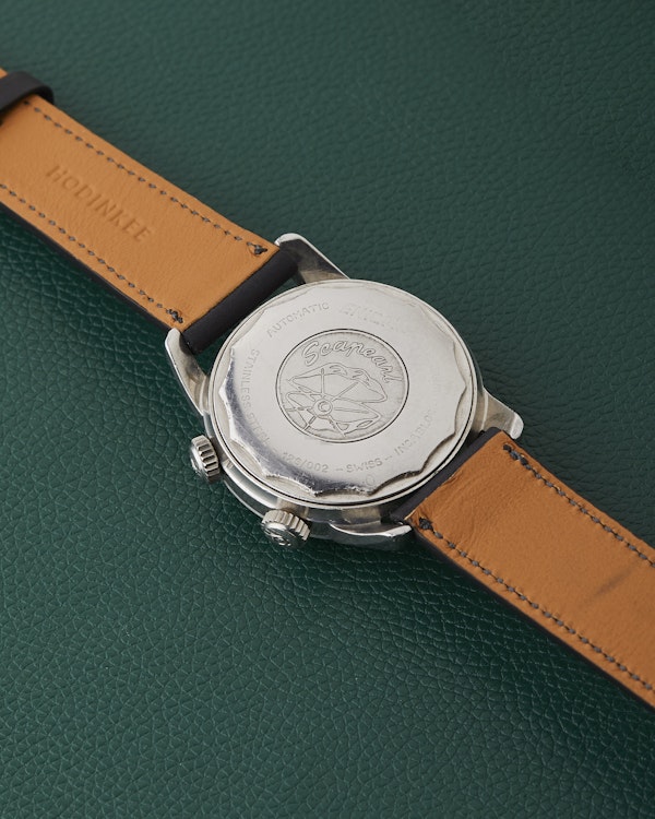 Its 36mm stainless steel Super Compressor case is fitted with two Enicar signed cross hatch crowns. The caseback features the Enicar Seapearl logo.