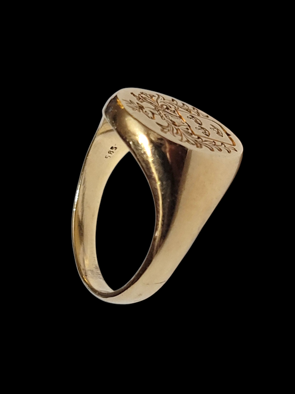 Oval signet ring engraved with a full coat of arms, stag to top of a knights helmet with a shield engraved with three cornucopia. 15mm x 12.5mm head. Currently finger size M (U.S 6.25) I believe this ring to of the Hunter family of Medomsley, County Durham, England. Hallmarked 585 (14ct)