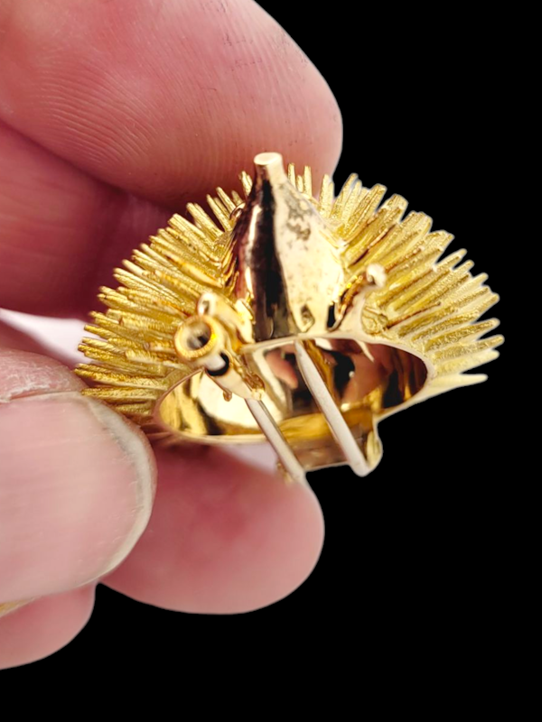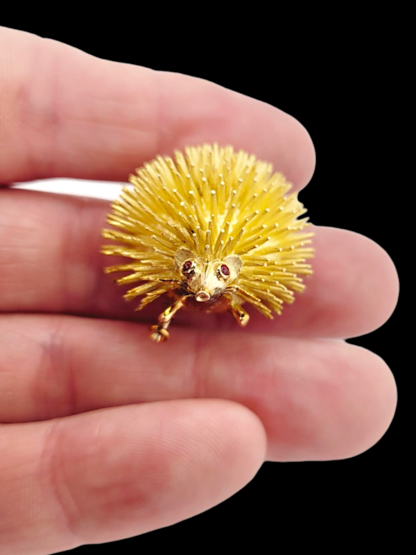 This little character makes you smile! 18ct buttery yellow gold hedgehog bristling with quills, ruby eyes and pointy nose. French Hallmarked and maker's mark. Also marked 750. French circa 1970. 35mm