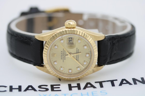 The Rolex Lady Datejust 69178 is a timeless expression of grace and craftsmanship. The solid 18ct yellow gold case, fluted bezel, and flawless diamond dial give this piece an unmistakable presence on the wrist. Recently serviced and performing perfectly, this example offers exceptional value for a solid gold Rolex with factory diamond detailing.