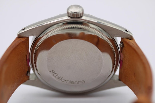 A La Californienne creation takes the timeless Rolex Oyster and gives it a fresh, Californian twist — playful yet luxurious, classic yet modern. This turquoise and pink configuration is among the most desirable colourways, combining artistic craftsmanship with horological heritage. A perfect choice for collectors and style-forward enthusiasts & alike.