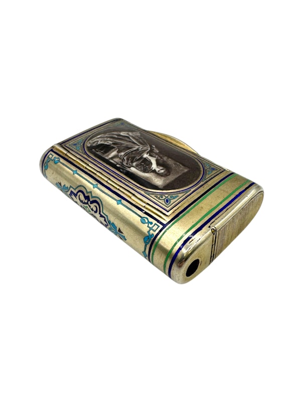 Russian silver gild and champeve enamel pictorial cigarette case, Moscow, 1879 by Pavel Ovchinnikov.