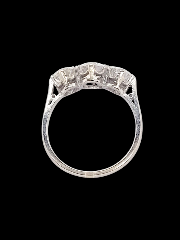 1.60cts of brilliant cut diamonds (0.70ct 2 x 0.45cts) G colour Vs2 clarity, set in 18ct white gold. American circa 1940. Currently finger size M 1/2. Excellent condition and highly recommended.