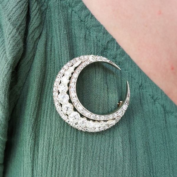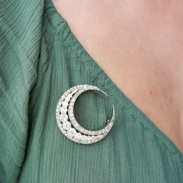 A Victorian three row crescent brooch, with a removable, original, sapphire insert and newly made, removable, old-cut diamond and ruby inserts, with the sapphire and the rubies mounted in gold and the diamonds mounted in silver-upon-gold, with a surround of old-cut diamonds, graduating from the centre, with a channel of old-cut diamonds, in grain settings, with flat edge on the inside, and a row of old-cut diamonds, in grain and cut down settings, over a gold, pierced gallery, on the outside curve, mounted in silver-upon-gold, circa 1890, with a later pin and roller catch fitting. In Victorian symbolism the crescent or new moon represented a new relationship. Hopeful it will "wax" into matrimony.
